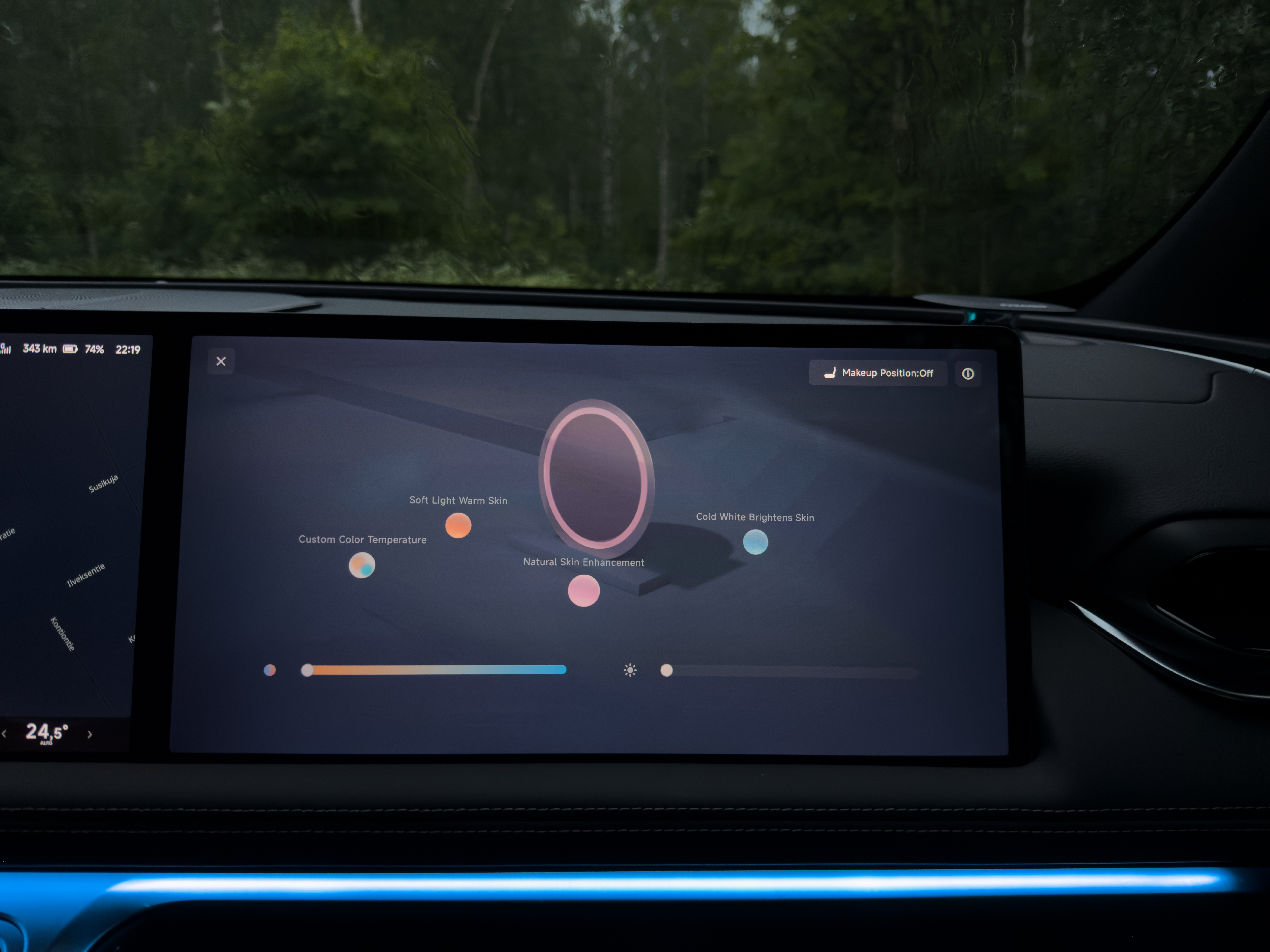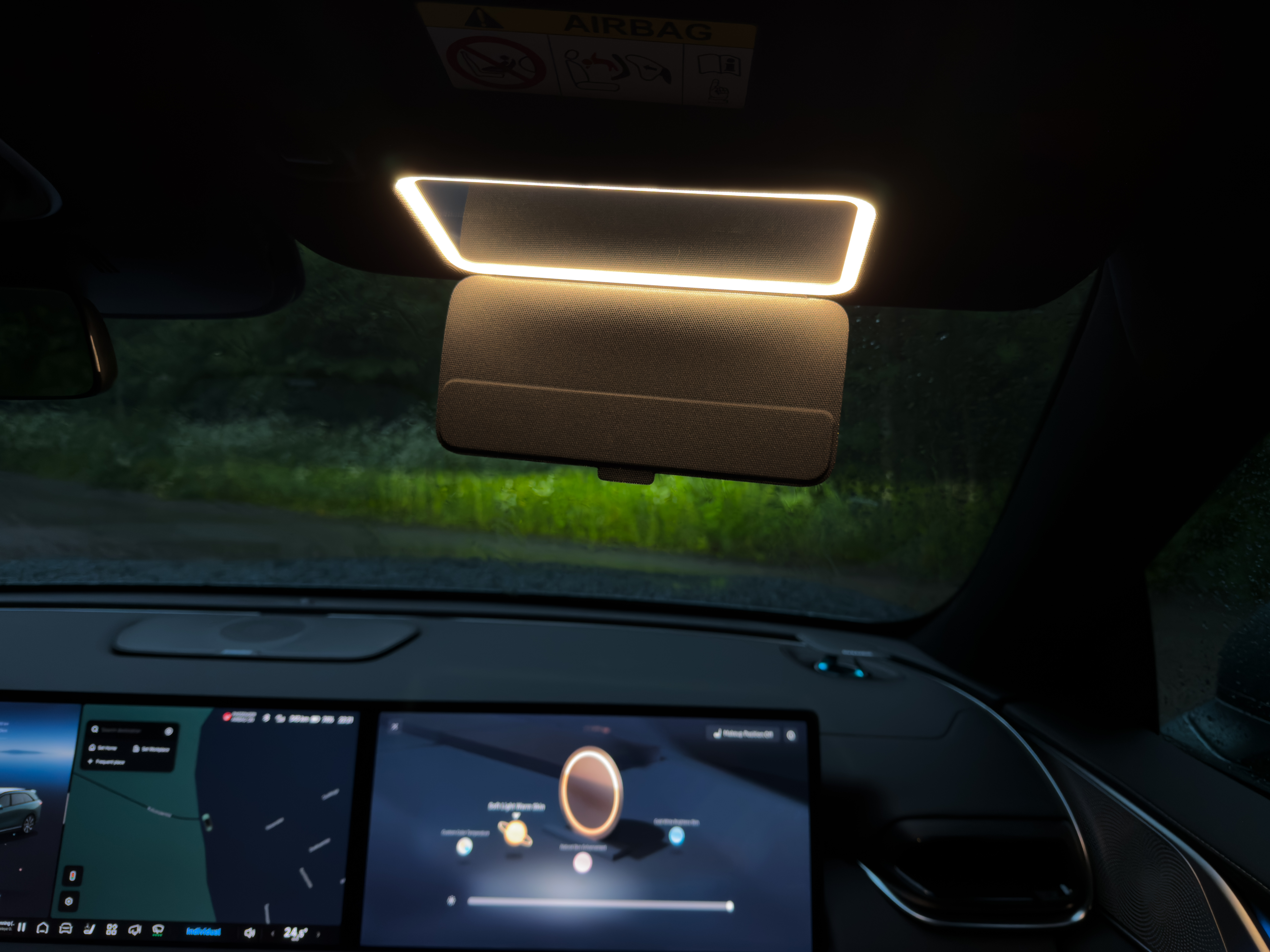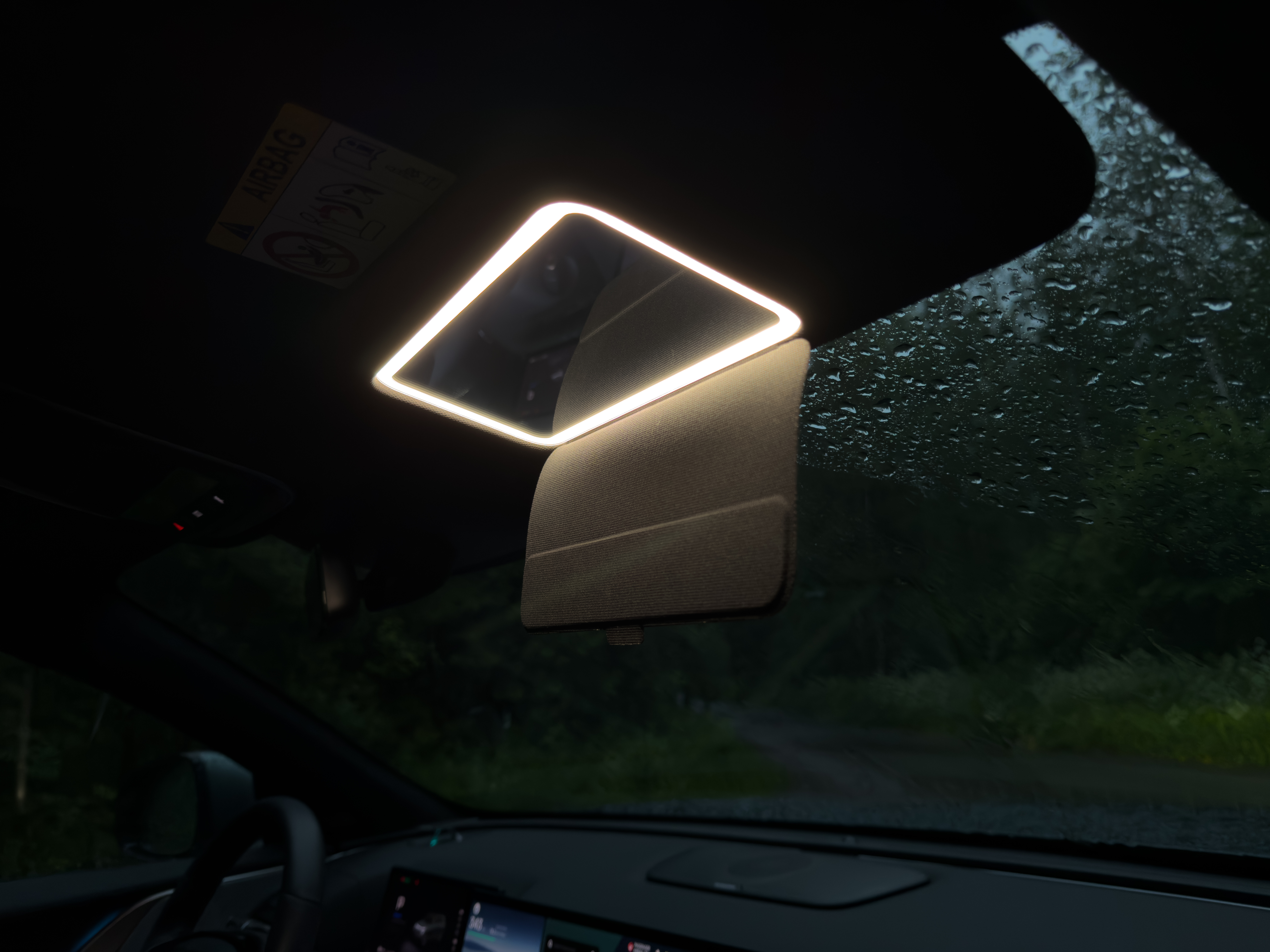 Yksi ainutlaatuinen ominaisuus löytyy apukuljettajalle tarkoitetusta peilistä — värilämpötilan säädöllä varustettu valaistus. Erityisesti naisille suunnattu meikkausvalo, jossa värilämpötilaa voi säätää Toteutuskin on upea, näyttöön tulee värilämpötilan säätö kun peiliä avataan ja käytetään.