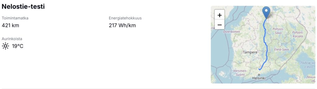 Matkasta oli jäänyt alle 50 km ajettavana ja auto muuttikin mieltä. Emme pääse perille, eikä lähistöllä ole latureita. Pääsimme juuri ja juuri perille hieman pudottamalla vauhtia. Huhhuh, reitinsuunnittelijan arviointia jos uskaltaa luottamaan, kannattaa tuplata kaikki arviot ja ladata enemmän kuin se ehdottaa. Hyvä suositus olisi käyttää ABRP (A Better Route Planner), se osaa hyvin arvioida varausprosentteja.